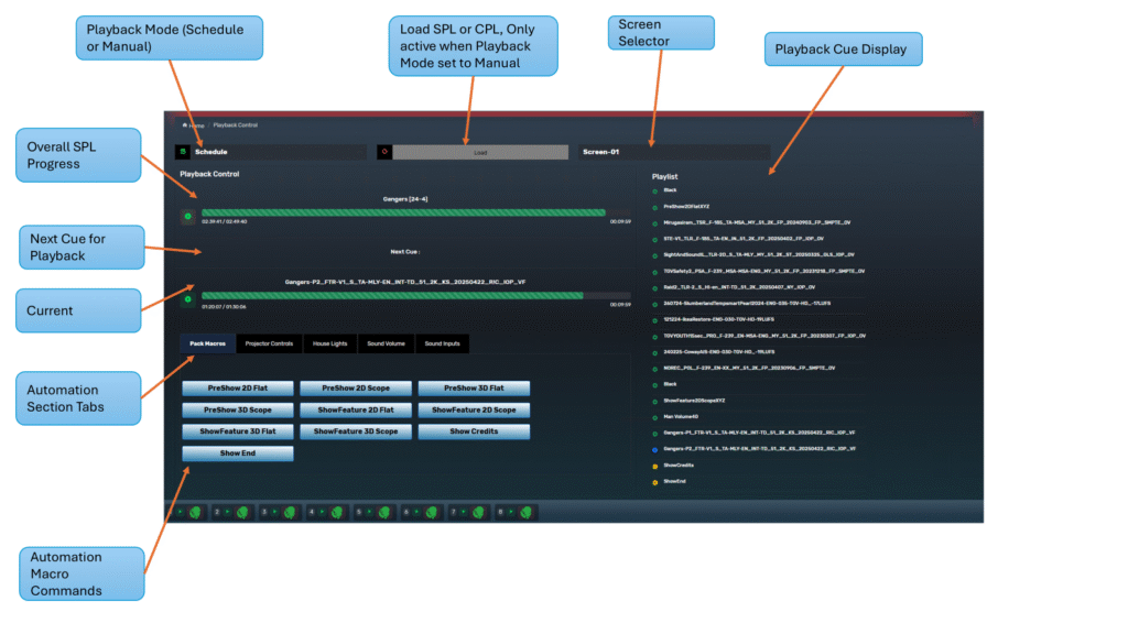 The Playback Control screen is the live control center for cinema playback operations. Use it to: