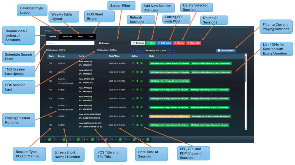 The Scheduler module in TMS provides a centralized view to monitor, edit, and manage scheduled show sessions across all screens. The List View is designed for operational efficiency with powerful filters, session diagnostics, and playback synchronization with POS.