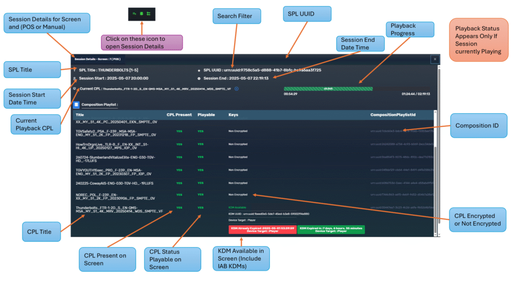 The Session Details View provides an in-depth look at a specific scheduled session, including the SPL, current playback progress, and CPL/KDM statuses for the screen.