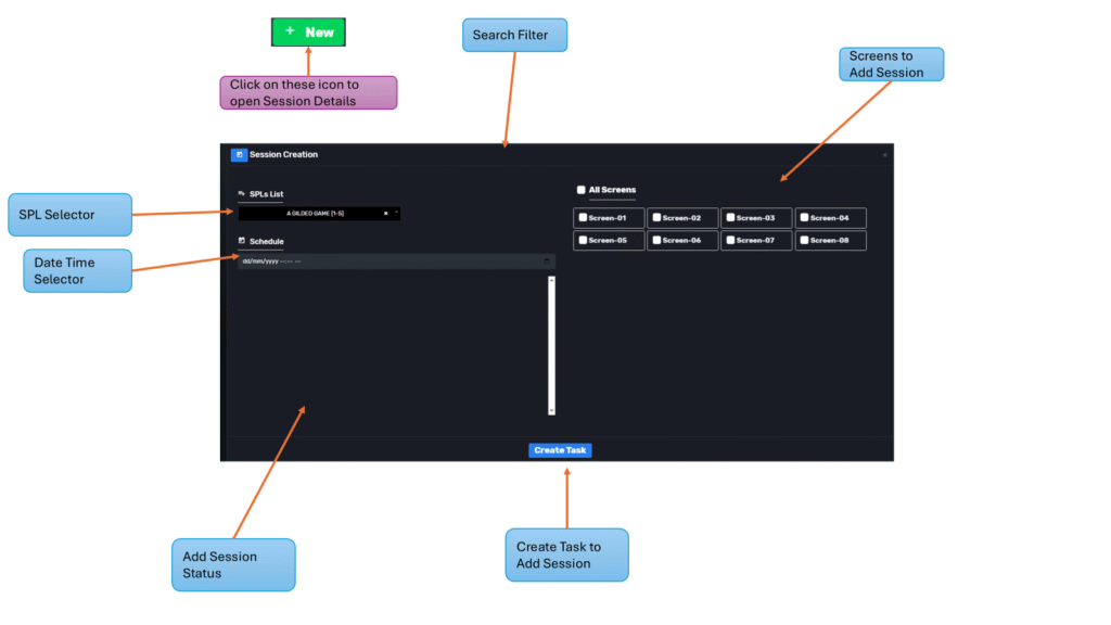 Search FilterLocated at the top-left, this allows quick search by movie title, SPL name, or screen ID.